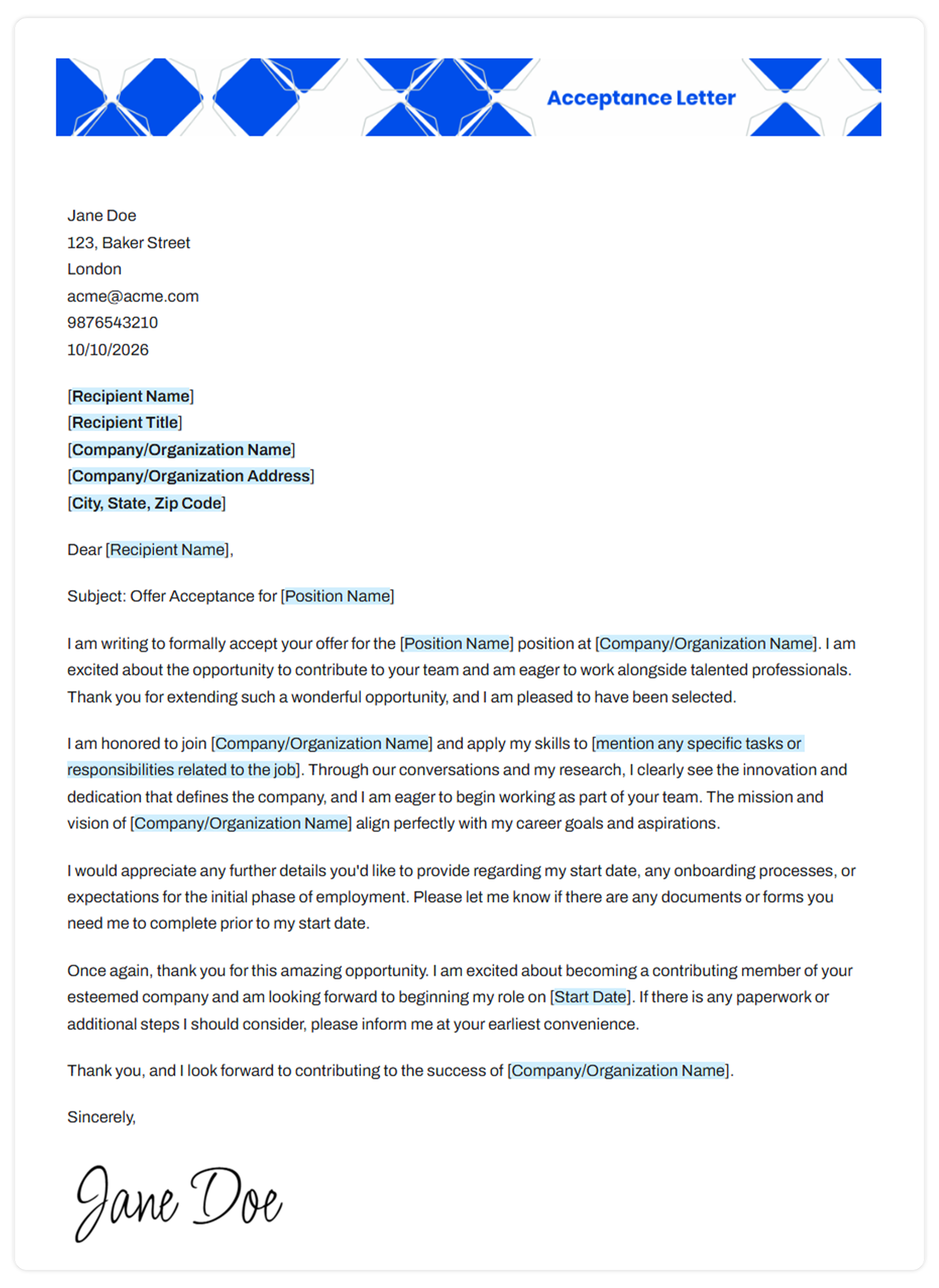 An acceptance letter is a message that confirms to the company that you agree to the terms of an offer, invitation, or proposal. It helps both parties move forward with a clear understanding and shows professionalism.