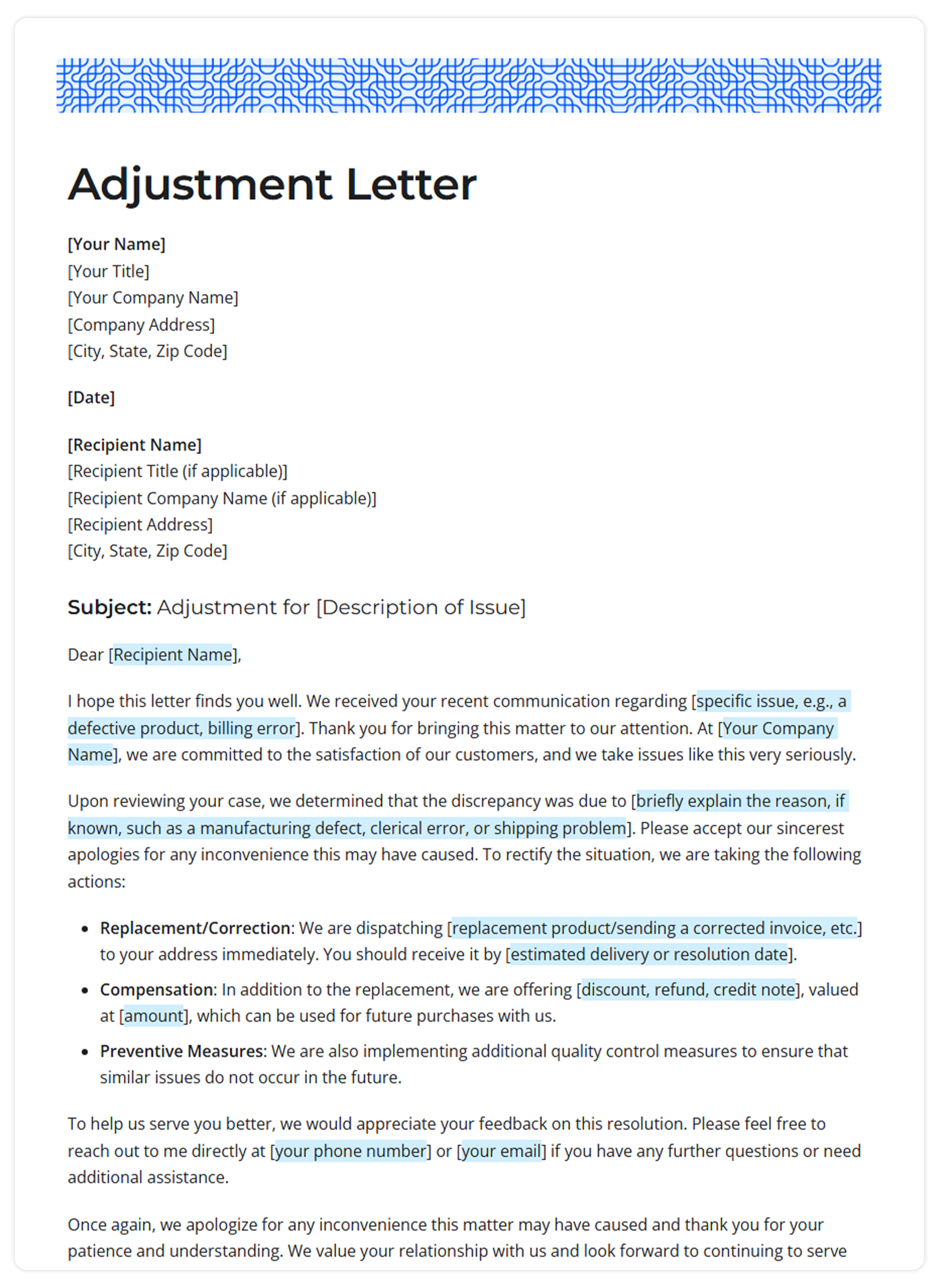 Use Case: Businesses send adjustment letters to reassure customers, protect their reputation, and solve issues quickly when problems arise.
