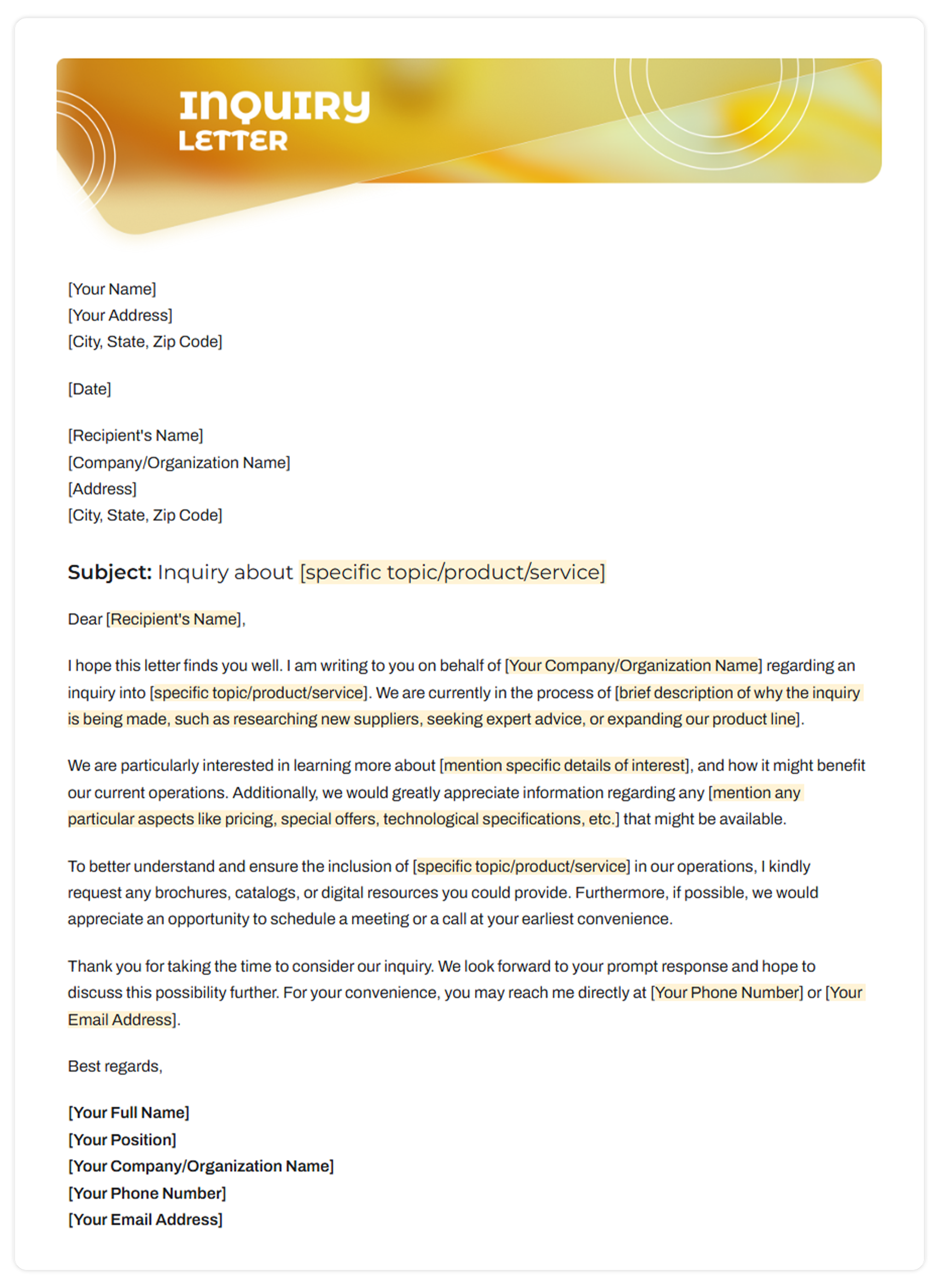 Use Case: Inquiry letters can be used when you are considering a possible purchase, partnership, or seeking information regarding a job or business opportunity.