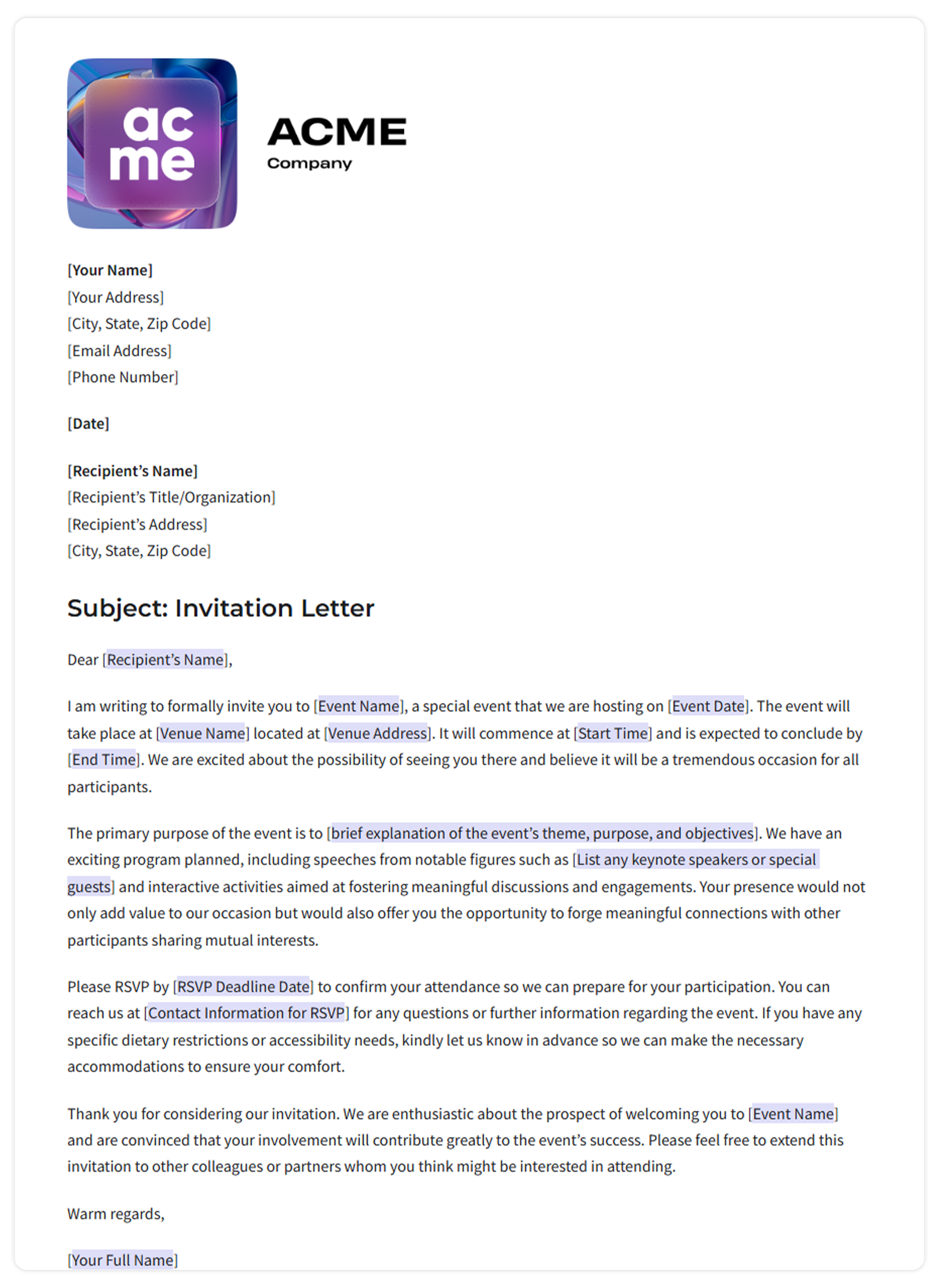 Use Case: These letters are commonly used to invite guests to business conferences, product launches, and important meetings, ensuring recipients have all the necessary information well in advance.